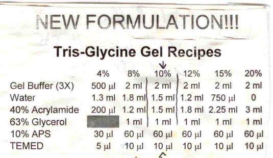 1X running buffer: 2 L 5X buffer + 50 ml of 20% SDS + 7950 ml H2O.